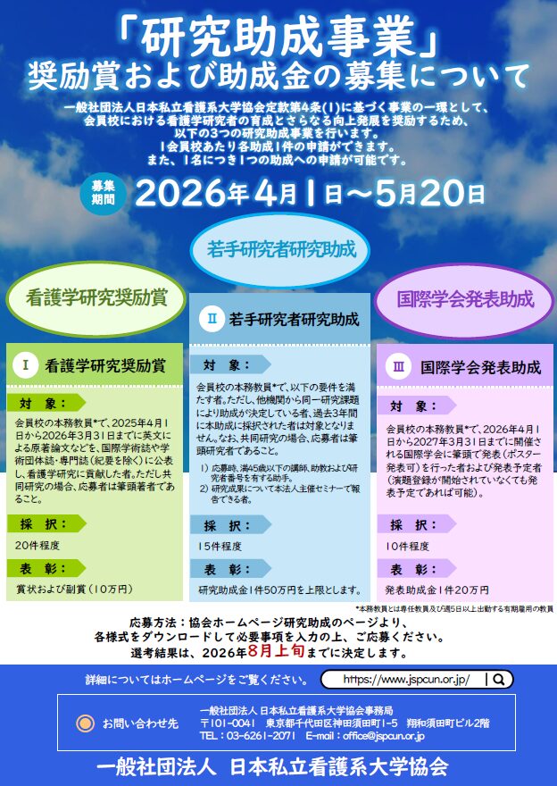 一般社団法人日本私立看護系大学協会定款第4条第1号に規定する事業活動の一環として、看護学研究者の育成と、さらなる向上発展を奨励するため、以下の3つの研究助成事業を行います。