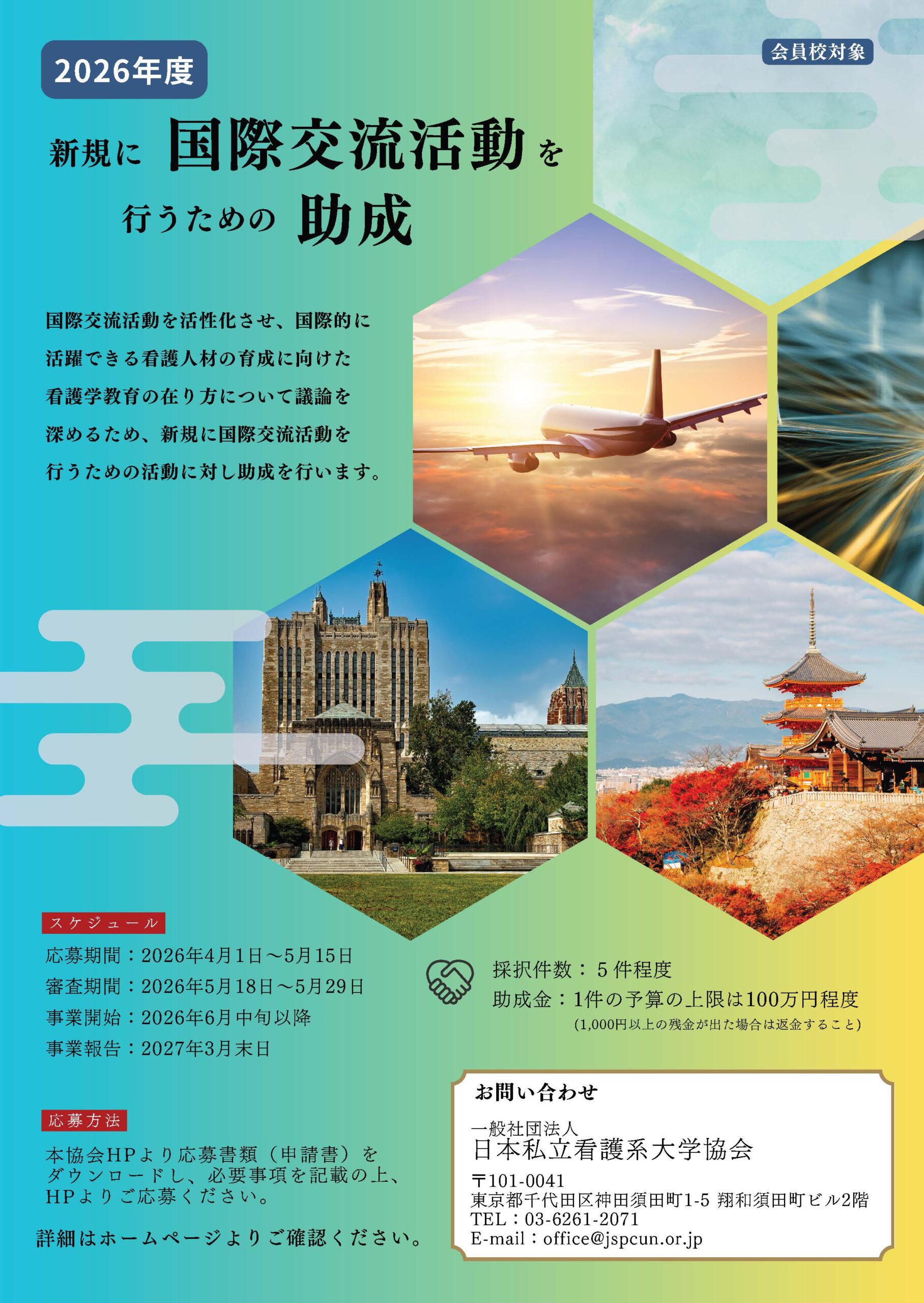 国際交流活動を活性化させ、国際的に活躍できる看護人材の育成に向けた看護学教育の在り方について議論を深めるため、新規に国際交流活動を行うための活動に対し助成を行う。