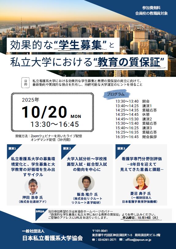 私立看護系大学における効果的な学生募集と教育の質保証の両立に向けて、最新動向や実践的な視点を共有し、持続可能な大学運営のヒントを得ること